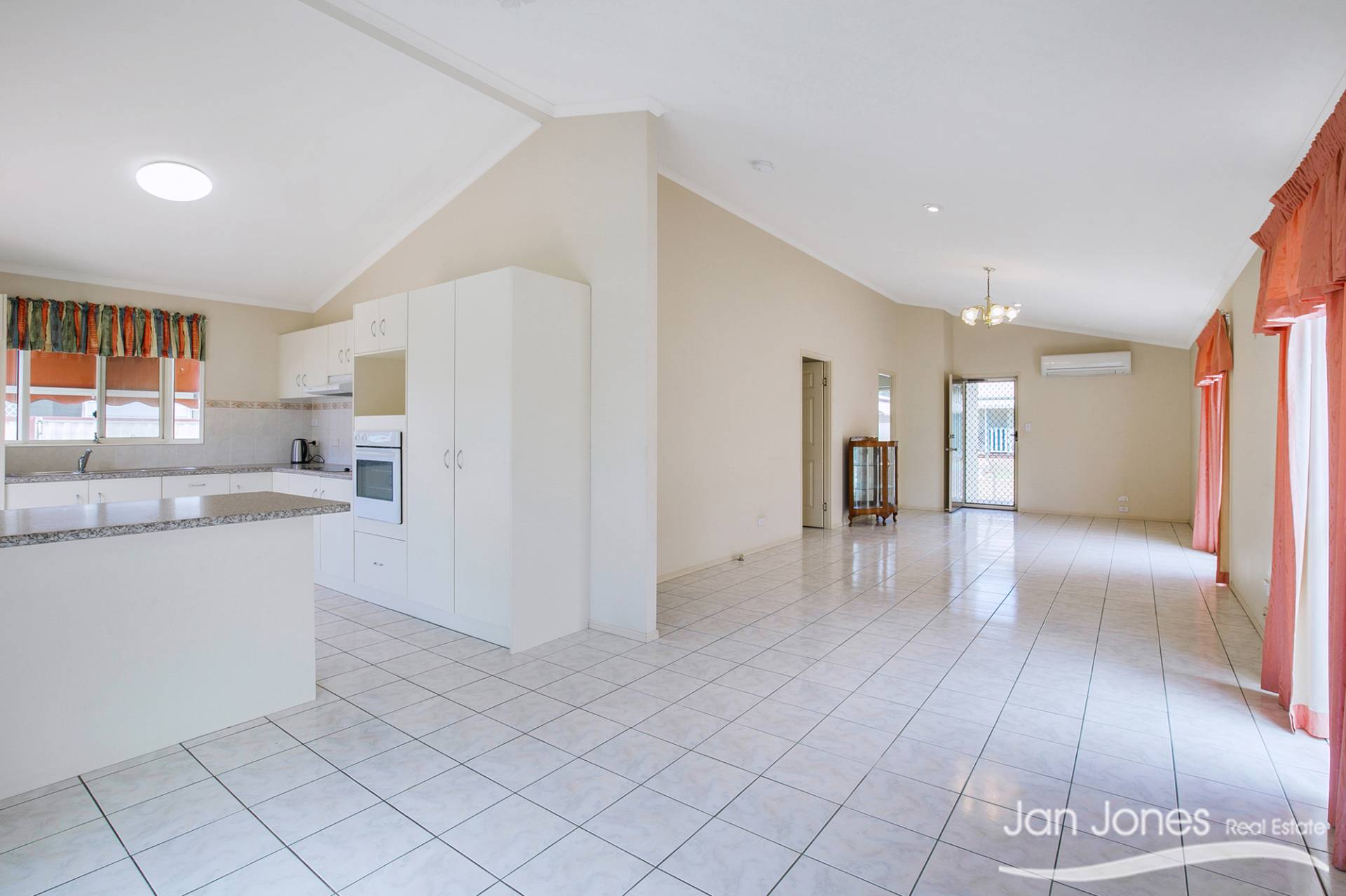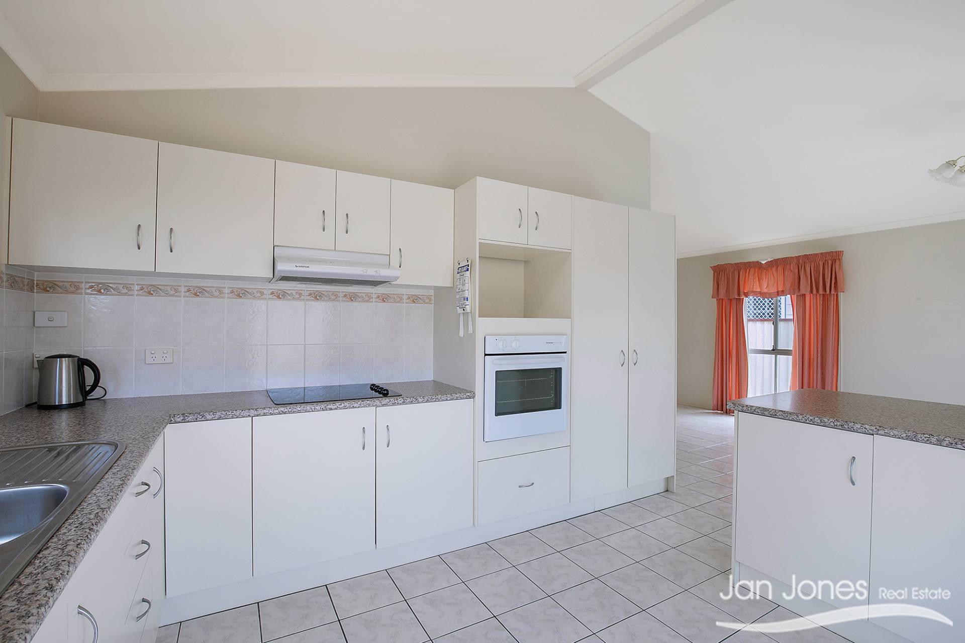 Open plan, modern kitchen with oven, cooktop, rangehood and plenty of cupboard and bench space with direct access out to the rear yard
