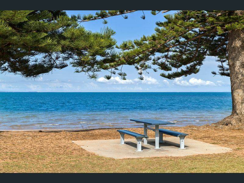 Upon entering, you'll find an open-plan kitchen and dining area, seamlessly flowing into a bright lounge room with beautiful, polished floorboards and ornate cornice. The lounge is air-conditioned and perfectly positioned to capture the beautiful bay breezes, with security screens on every window providing peace of mind—ideal for those living alone or want that added security.  The home’s character is further enhanced by 2 spacious bedrooms that are both equipped with split system air conditioning and large windows that capture the natural light and bay breezes over summer. The master has a large wardrobe.