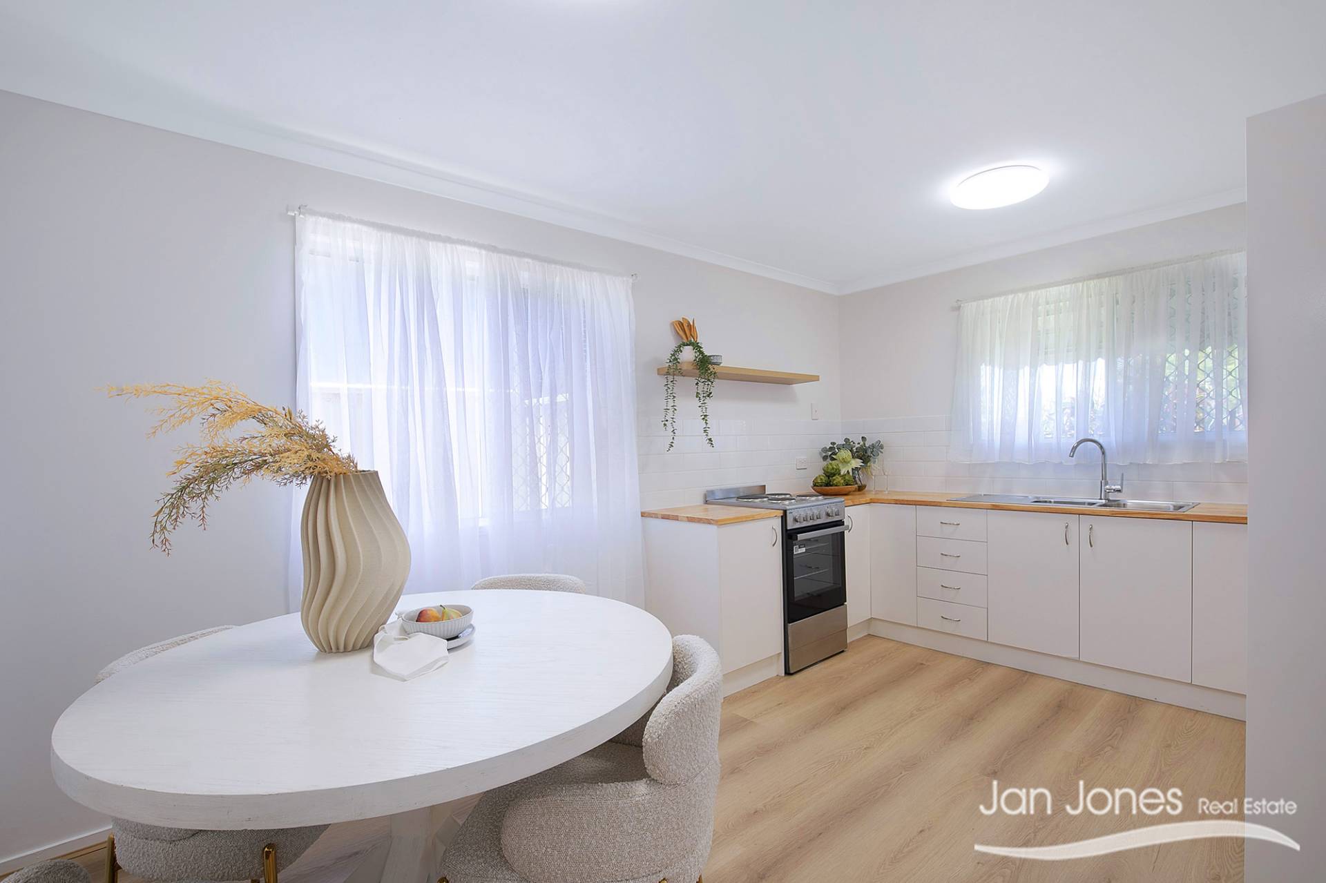Modern open-plan kitchen and dining area with a brand-new stainless steel electric cooktop, ample bench space, and plenty of cupboards.