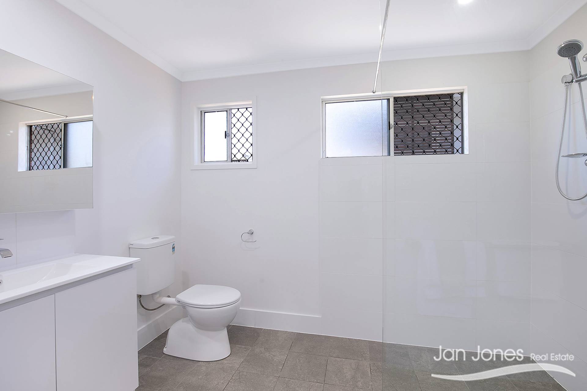 Beautifully renovated bathroom featuring an oversized shower, separate vanity unit and combined toilet.