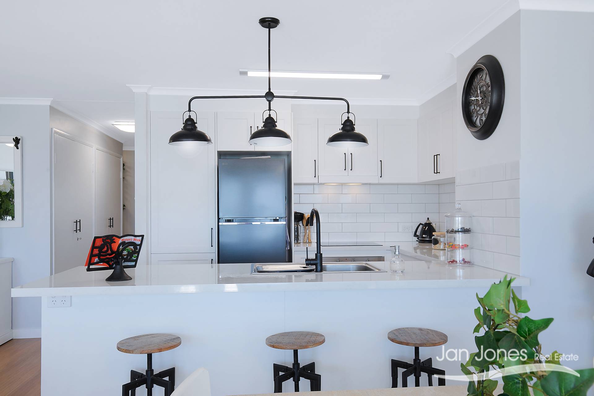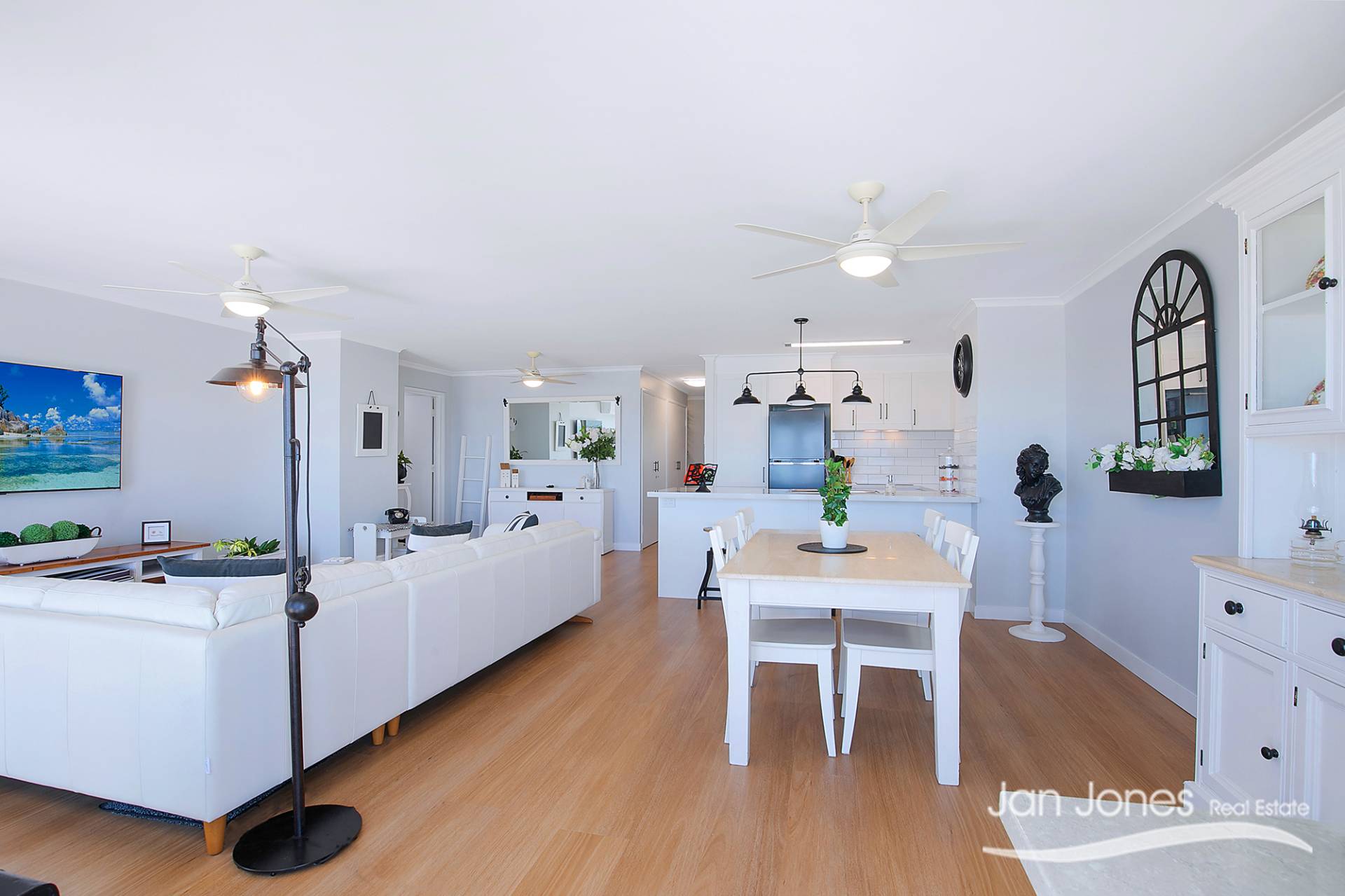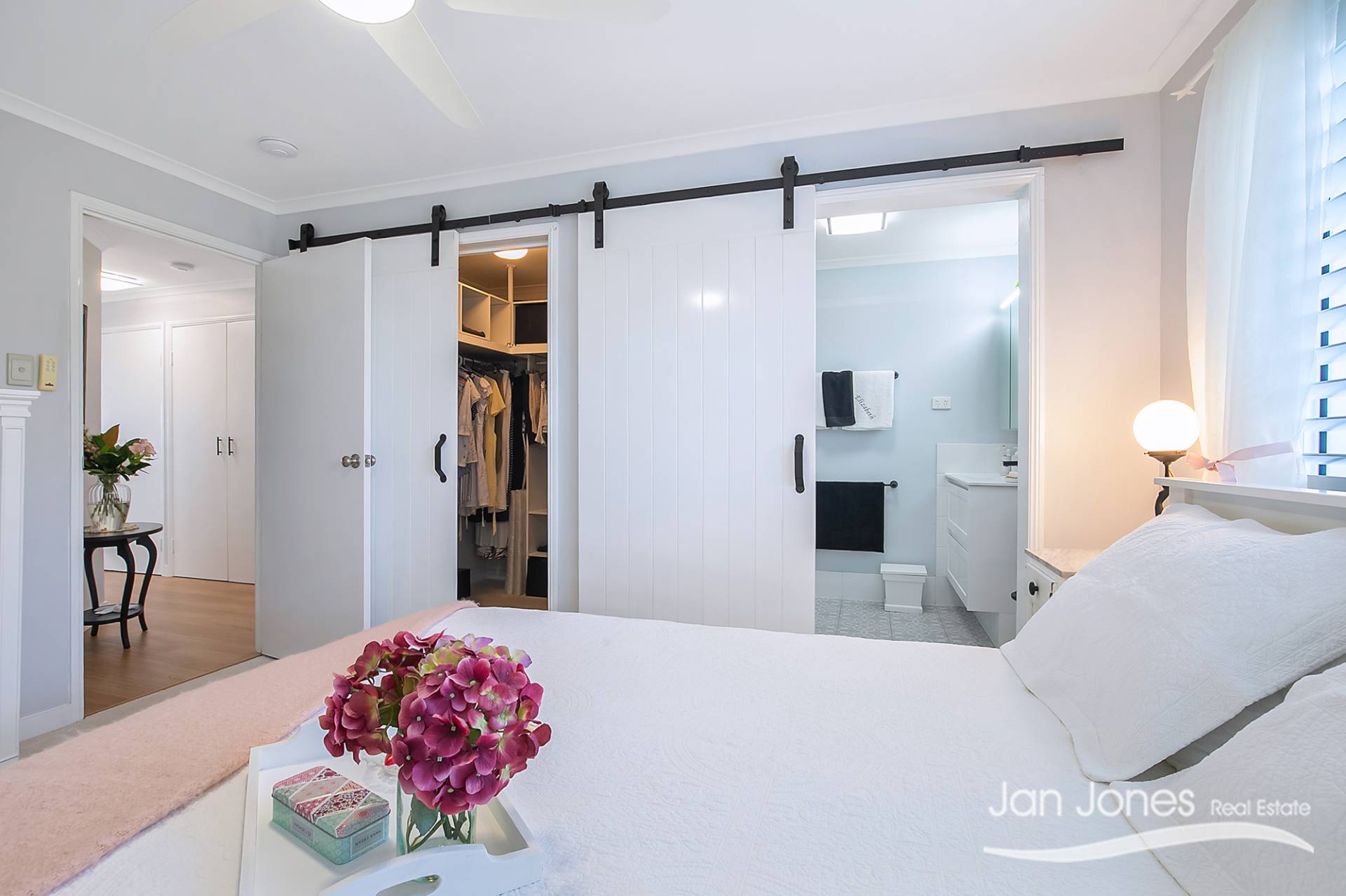 Three well-sized bedrooms, all with built-in wardrobes; the main bedroom includes air conditioning, a spacious walk-in wardrobe and ceiling fans