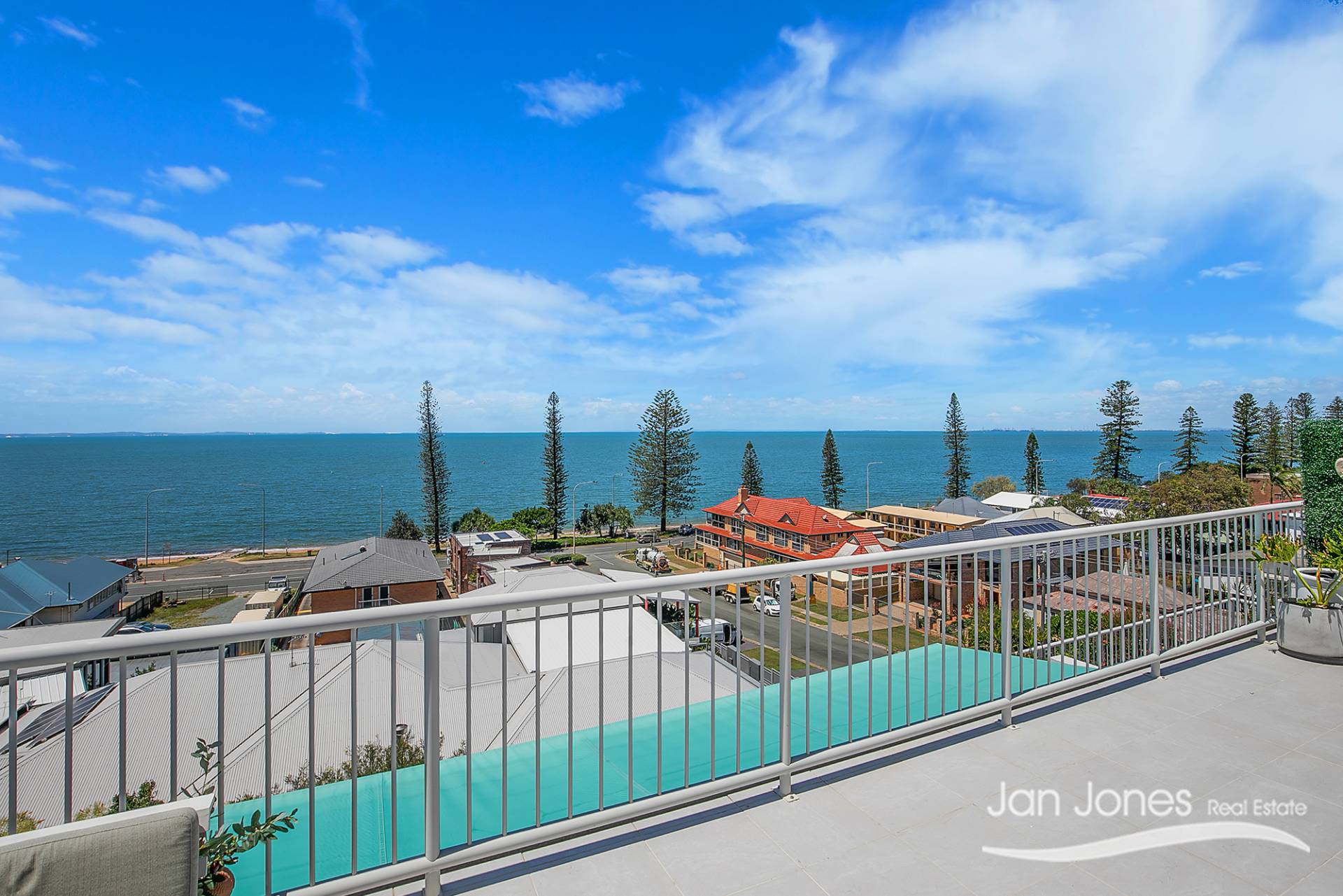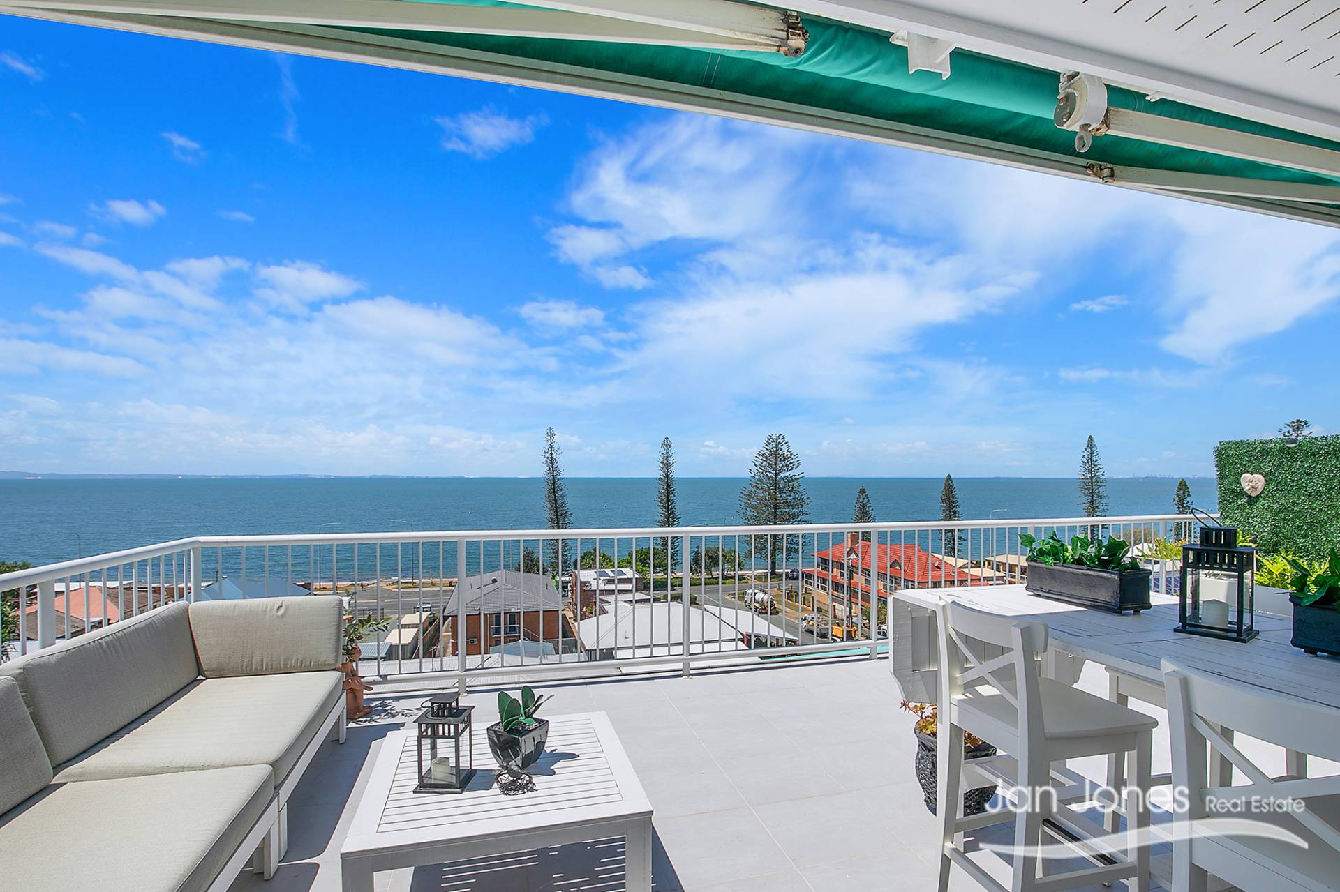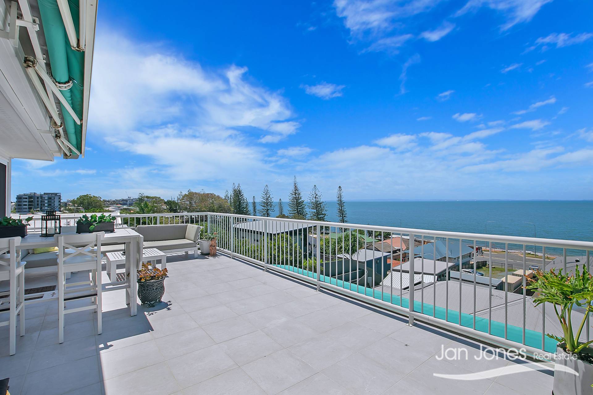Generous outdoor balcony with stunning water views across Margate Beach to Moreton Island that has an automatic awning for those hot summer days