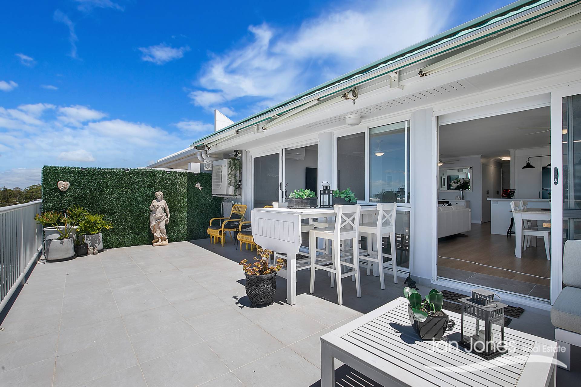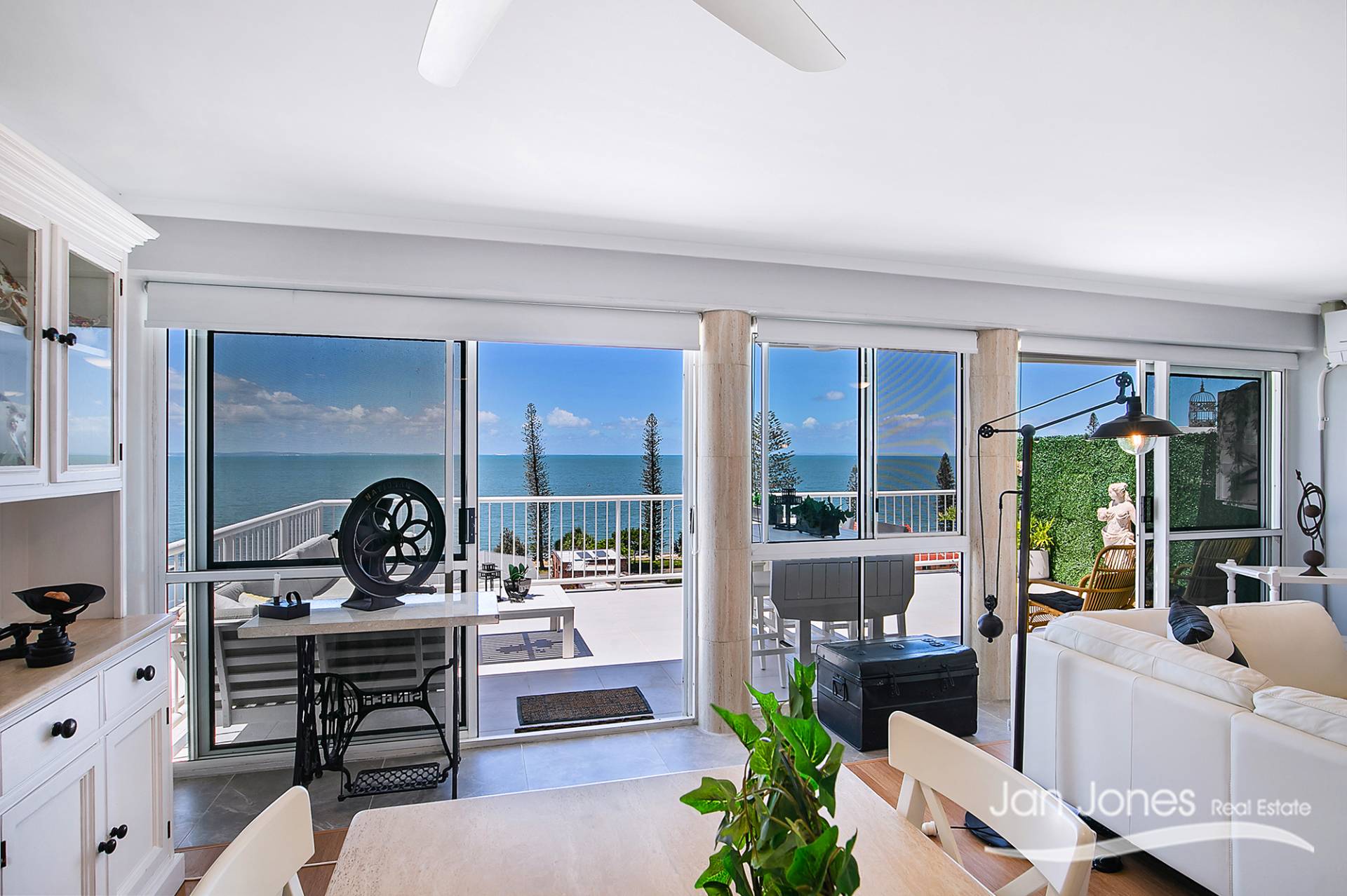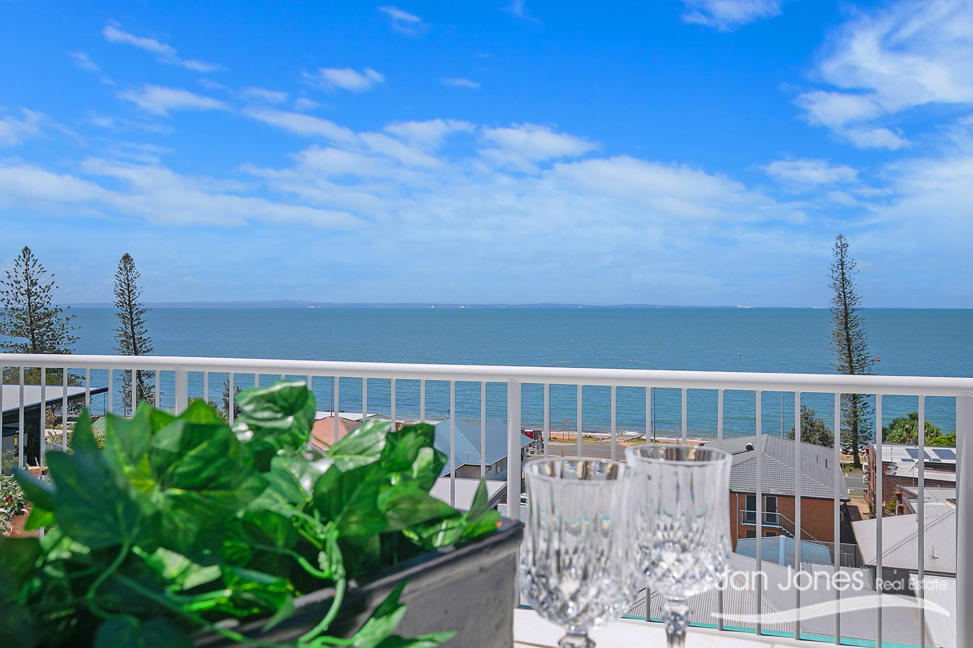 Generous outdoor balcony with stunning water views across Margate Beach to Moreton Island that has an automatic awning for those hot summer days