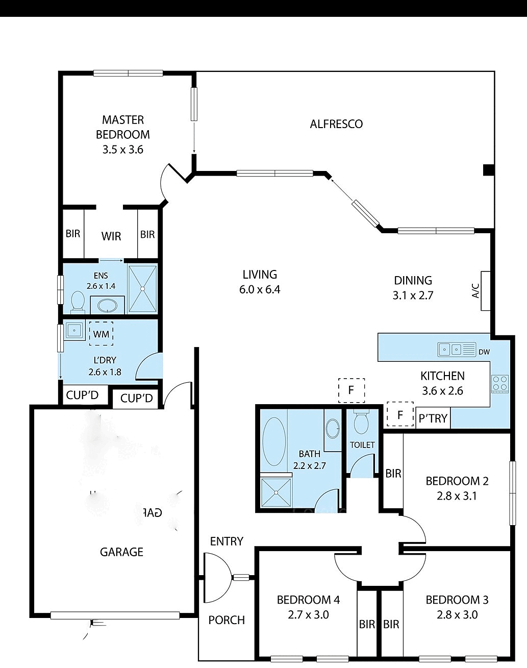 This family home consists of 4 bedrooms, all queen sized with built in wardrobes. The master is fit for a KING bed and has a large ensuite and walk through wardrobe with air conditioning.